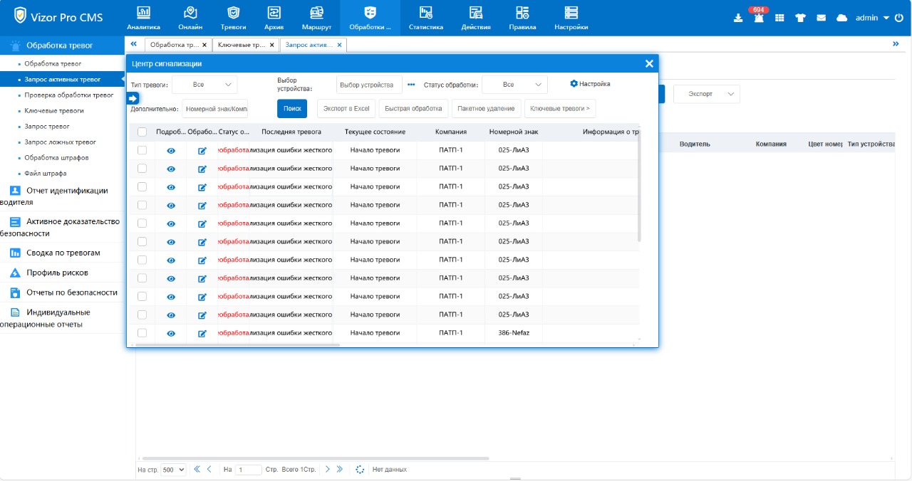 Обработка и аналитика тревог ADAS, DSM